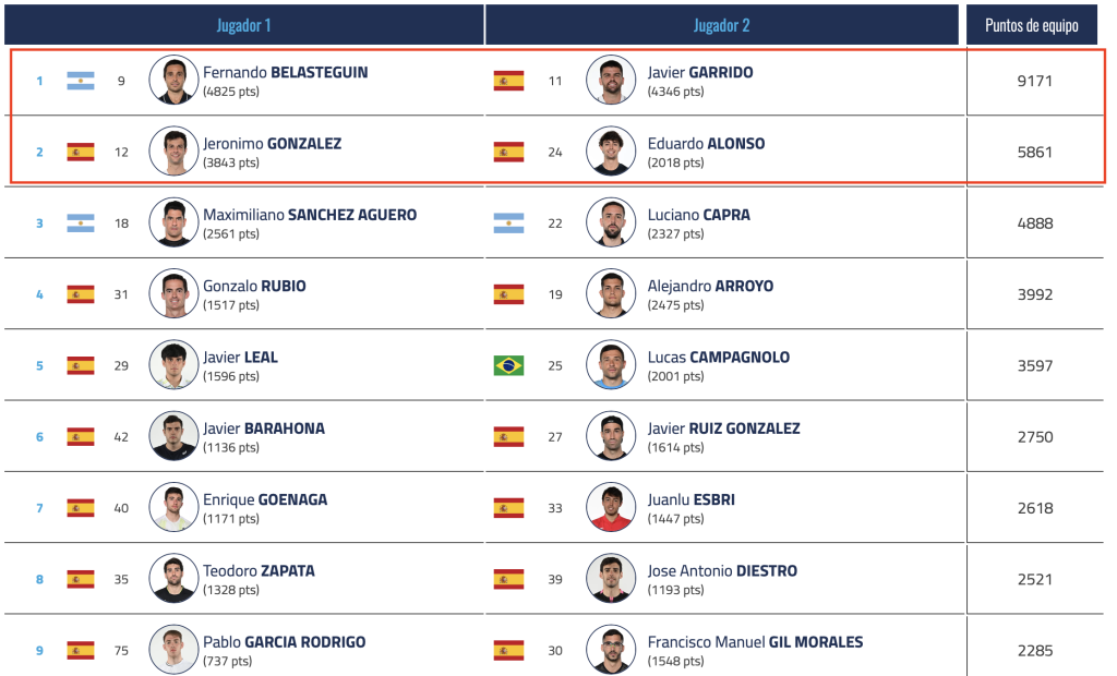 Ya ocurrió el año pasado con esta misma prueba, nos permitió ver parejas tan inverosímiles como la formada por Yanguas y Chingotto. Esta temporada es el turno de la unión entre Javi Garrido y Fernando Belasteguín. Todo hace indicar que esta pareja es puramente circunstancial, ya que Bela seguirá su proyecto con Tello y Garrido debutará con Álex Ruiz. A día de hoy son primera cabeza de serie y distan en 3.310 puntos de la segunda pareja.