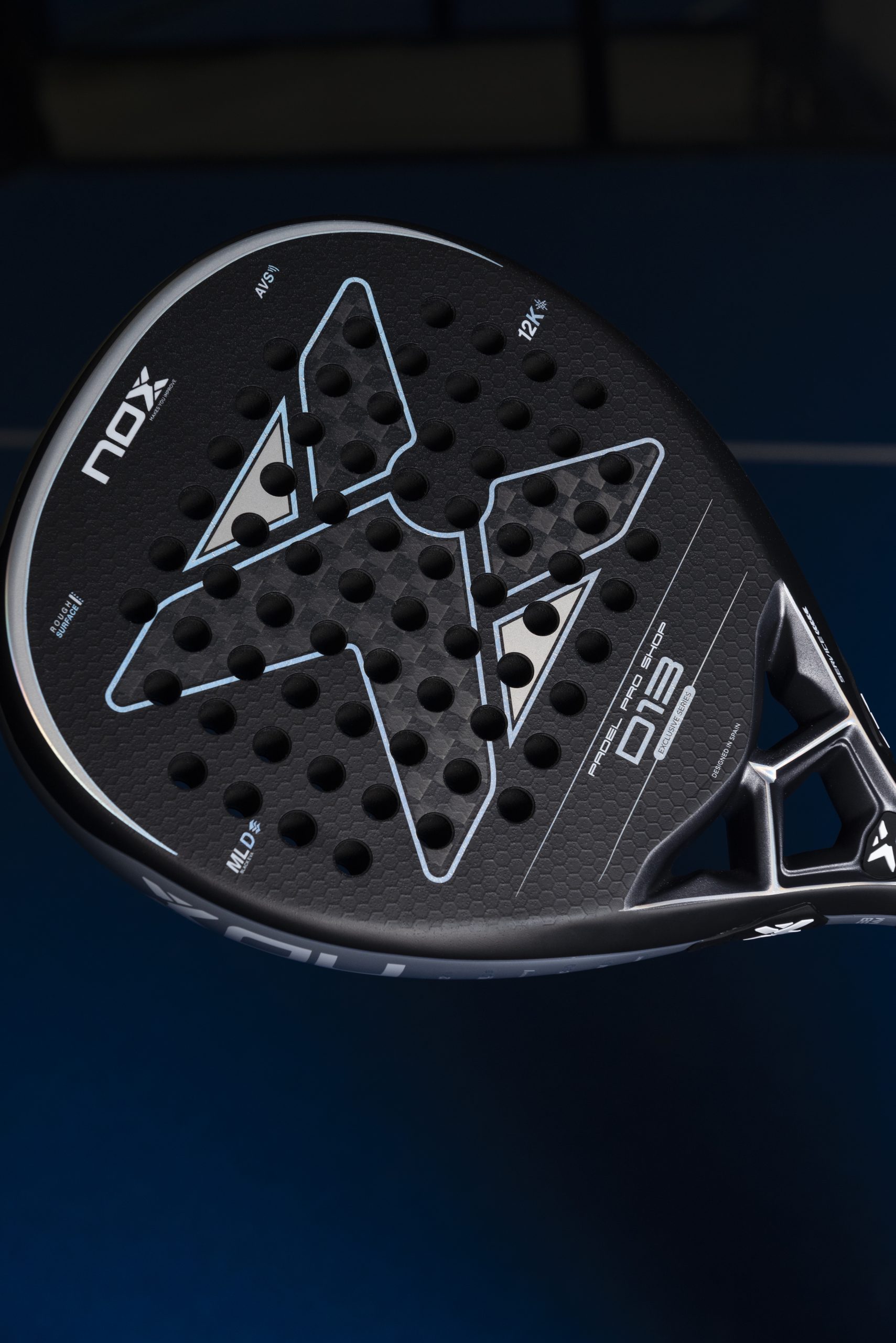 R: La NOX D13 lleva una configuración con goma MLD Black EVA Multicapa combinada con un carbono 12k. Además, cuenta con una doble capa rugosa, con 3D y una textura arenosa en la superficie. Elegí esta combinación porque buscaba una pala con un tacto seco y menos rebote, que me ofreciera un mejor control en el ritmo de ataque.