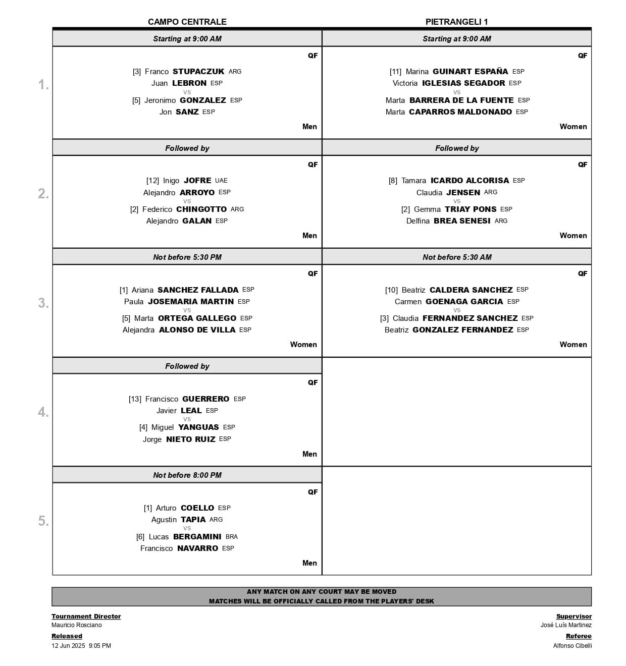 Los cuartos de final del Italy Major de este viernes 13 de junio arrancarán a partir de las 09:00 (04:00 en Argentina) en su jornada matutina. Una vez concluidos los 4 primeros partidos, la acción se reanudará ya por la tarde a partir de las 17:30 (12:30 en Argentina). Estos son los enfrentamientos y el orden de juego: