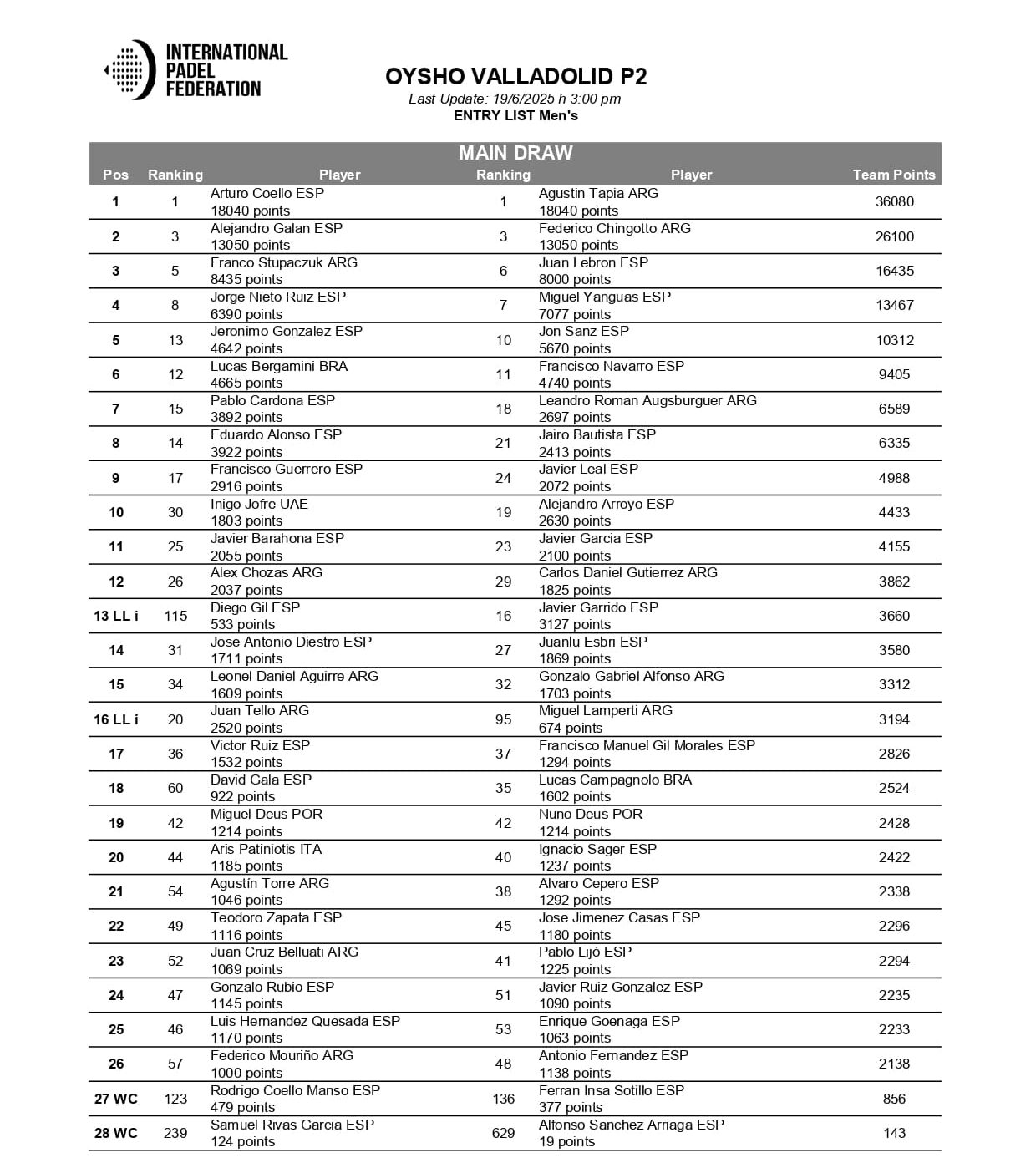 Juan Tello, cuyo compañero Martín Di Nenno se hizo un esguince en el Italy Major, jugará con una de las pocas leyendas en activo que hay en la actualidad, Miguel Lamperti. El jugador de NOX ha estado jugando con Juani Rubini en las últimas pruebas, partiendo siempre desde la previa. Ahora, debido a su unión con Tello, partirá en el Valladolid P2 como pareja número 16.