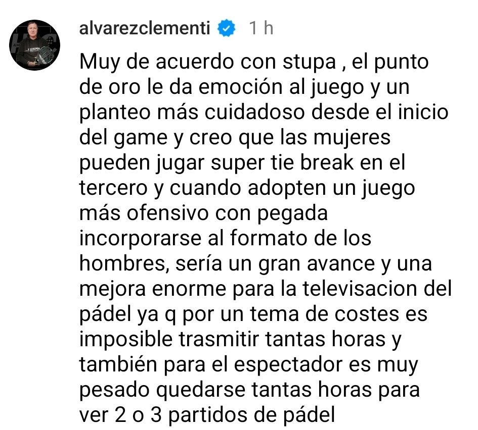 Todos tenemos derecho a expresarnos y dar nuestra opinión. El pádel se encuentra en un momento de máximo crecimiento y evolución, todas las ideas son buenas. ¿Vosotros qué preferís? ¿Se debería volver al punto de oro? ¿Pondrías un Super tie-break en el tercero en los partidos femeninos? ¿Qué otras medidas, en vuestra opinión, se os ocurren para mejorar el espectáculo?