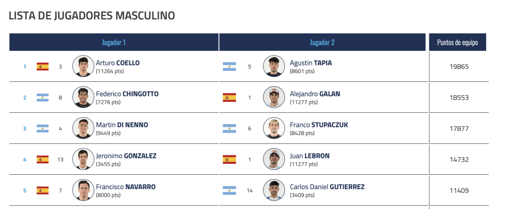 A su vez, vemos como la nueva pareja formada por Galán y Chingotto se sitúan en la segunda posición con 18.553 puntos, a tan solo 1.312 puntos de la primera posición que ostentan Coello y Tapia.