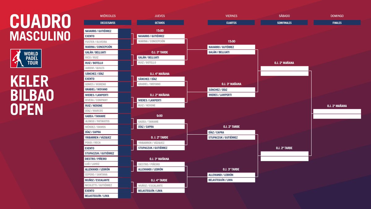 Cabe recordar que Fernando Belasteguín y Pablo Lima accedieron directamente a cuartos después de confirmarse a primera hora de la mañana la baja de Jordi Muñoz, quien arrastraba unos problema físicos del último Open.