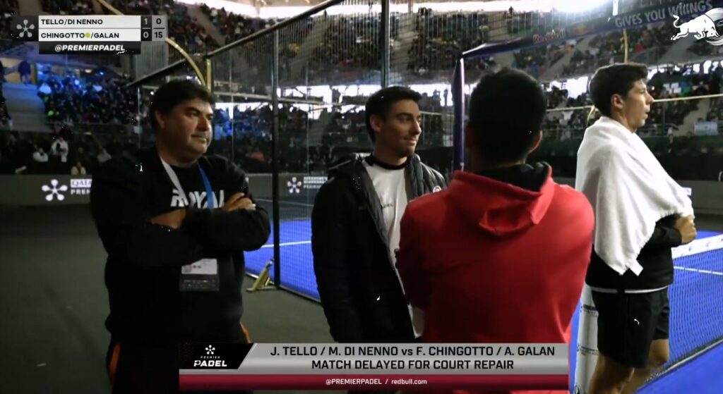 El primer partido del cuadro masculino, probablemente el más esperado del día, acababa de comenzar. Frente a frente, Chingotto/Galán contra Tello/Di Nenno. Todo parecía transcurrir con absoluta normalidad, especialmente teniendo en cuenta que ya se habían jugado allí mismo los dos primeros partidos femeninos.