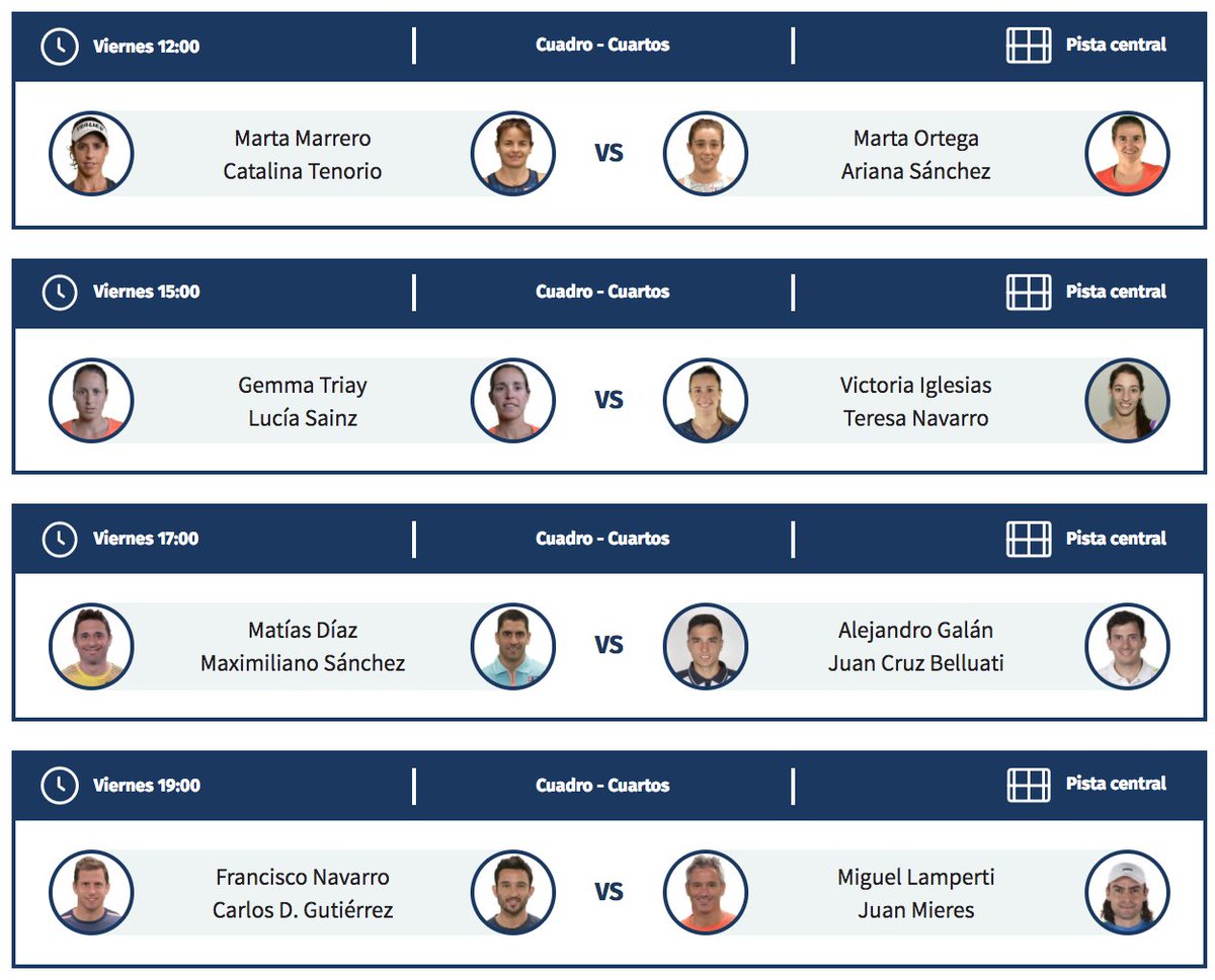 En el segundo partido de la primera jornada de los cuartos del Master final Mapi y Majo Sánchez Alayeto derrotaron a Cecilia Reiter y Carolina Navarro por un doble 6-2, mostrando como la pareja número uno del ranking femenino opta de nuevo a proclamarse ganadoras del título de maestras.