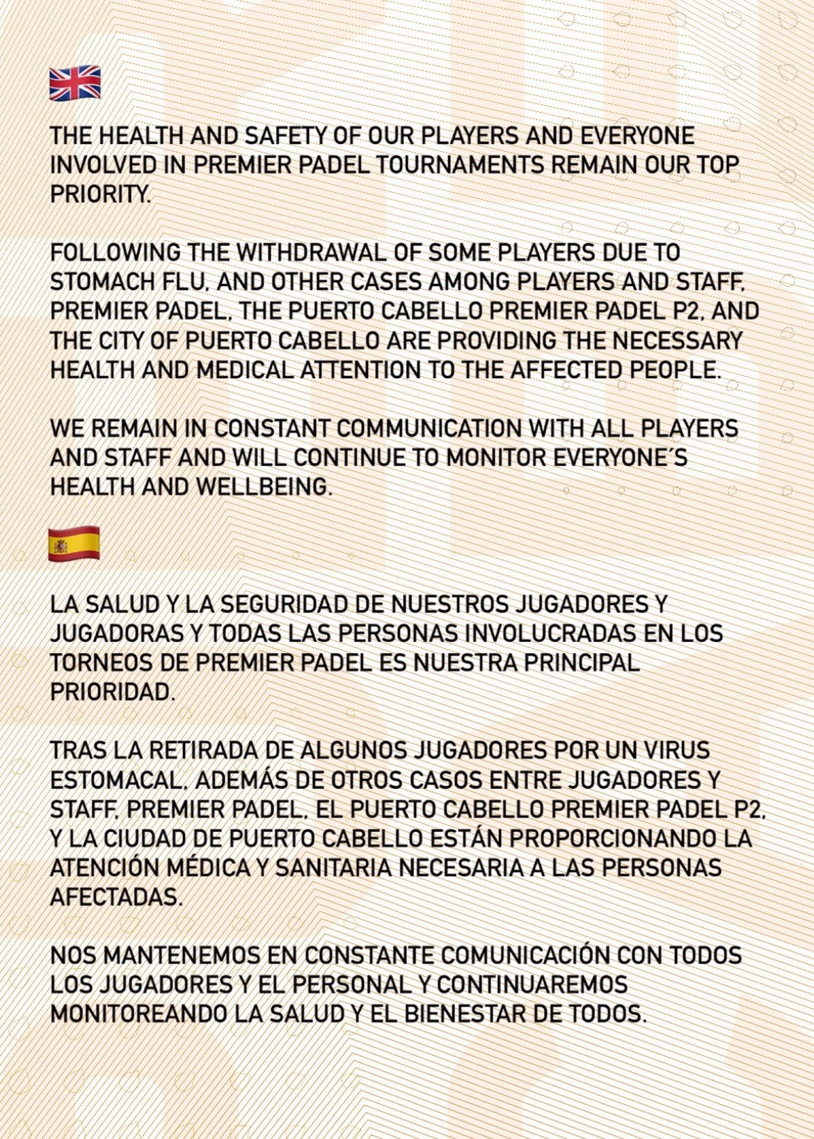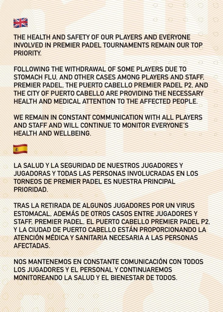 Muchas personas se vieron afectadas por lo que estaba ocurriendo. Gemma Triay también ha compartido en sus RRSS una imagen en una camilla de hospital con una vía abierta en su brazo. Con el paso de los días cada vez más y más participantes caían. Premier Padel se vio obligado a transmitir un comunicado oficial: