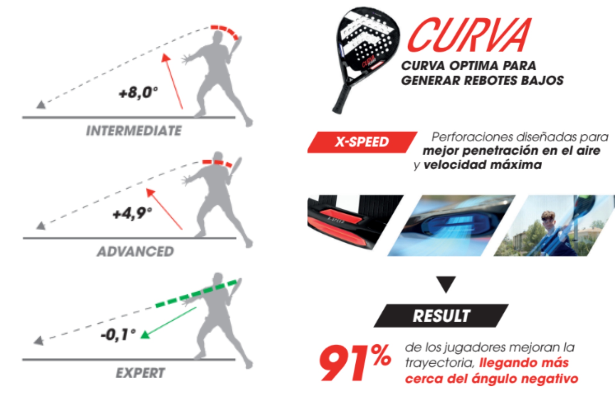 Según el golpeo, la pelota puede tener un ángulo positivo (de abajo a arriba) o negativo (de arriba a abajo). Este último es el óptimo para conseguir menor rebote y, por tanto, mayor nivel. Gracias a eso han desarrollado una serie de características que mejoran la trayectoria, consiguiendo que el 91% de los usuarios de Curva tengan un mejor ángulo en sus golpes para que la pelota rebote menos en el cristal.